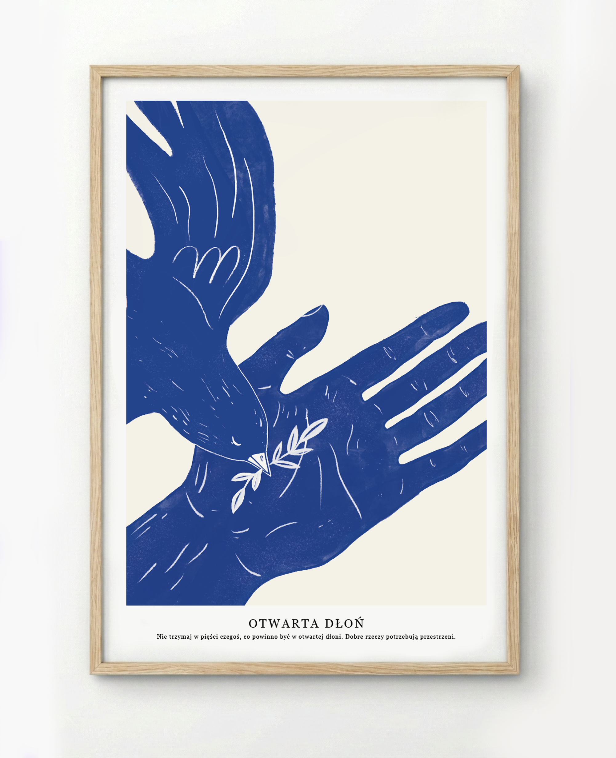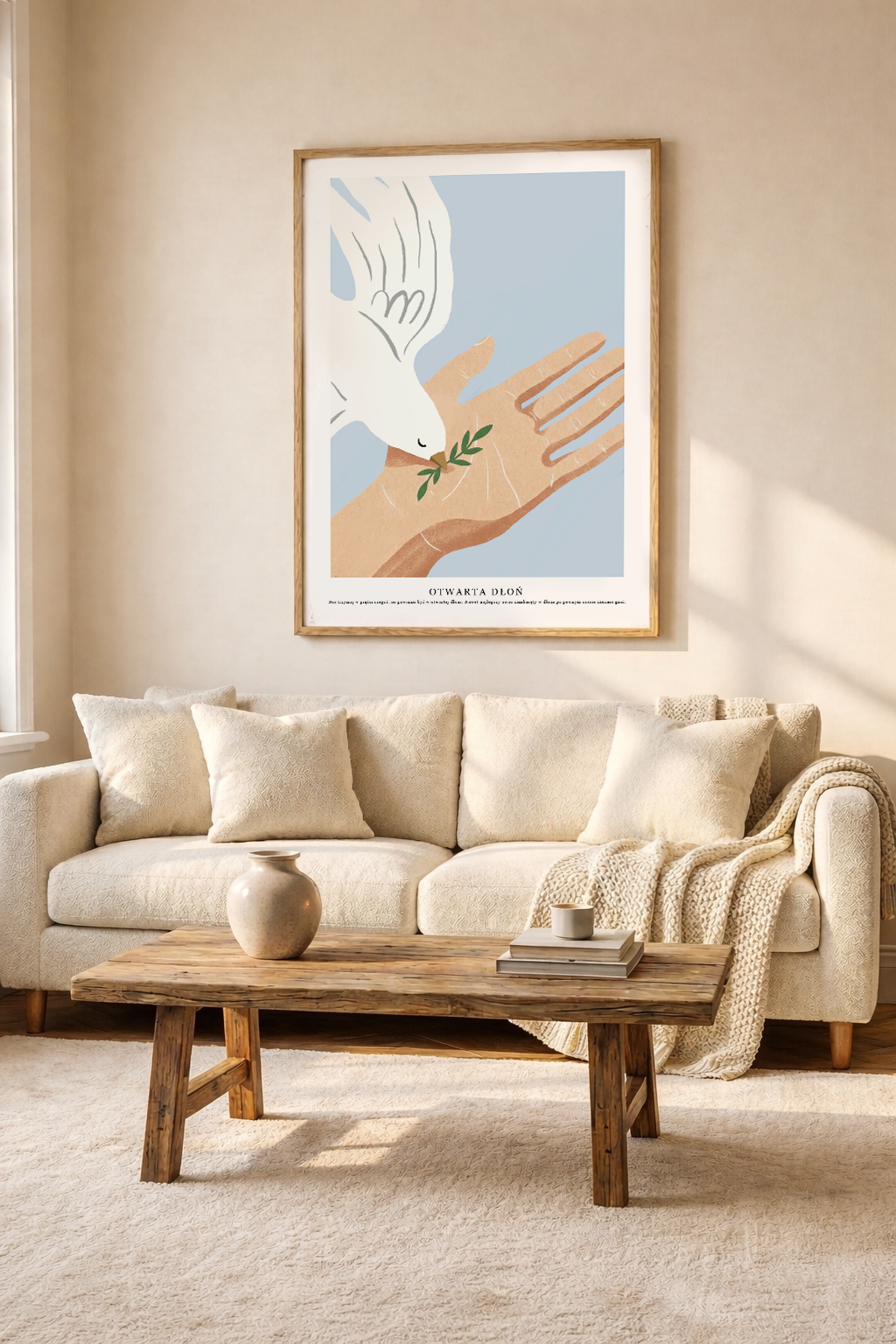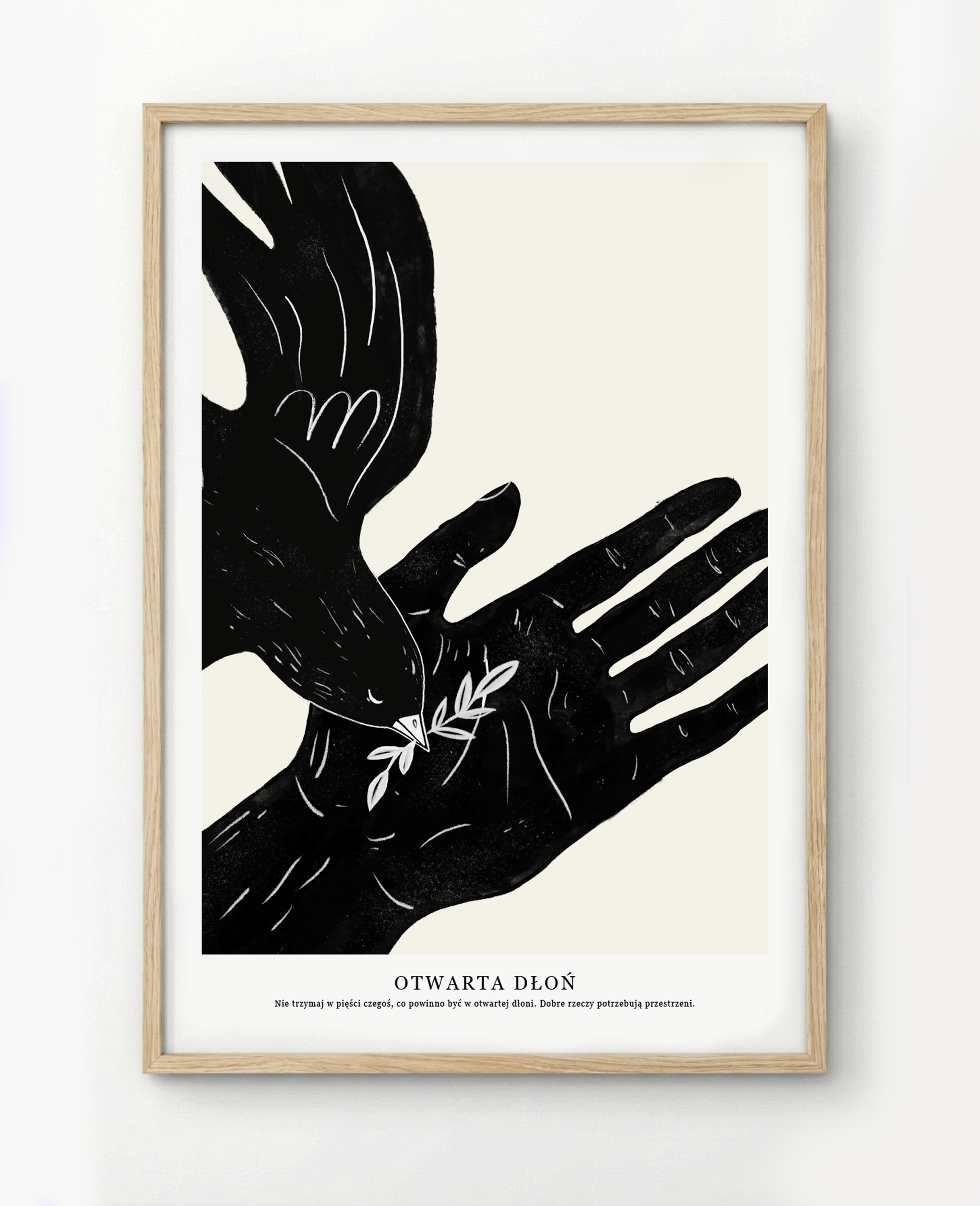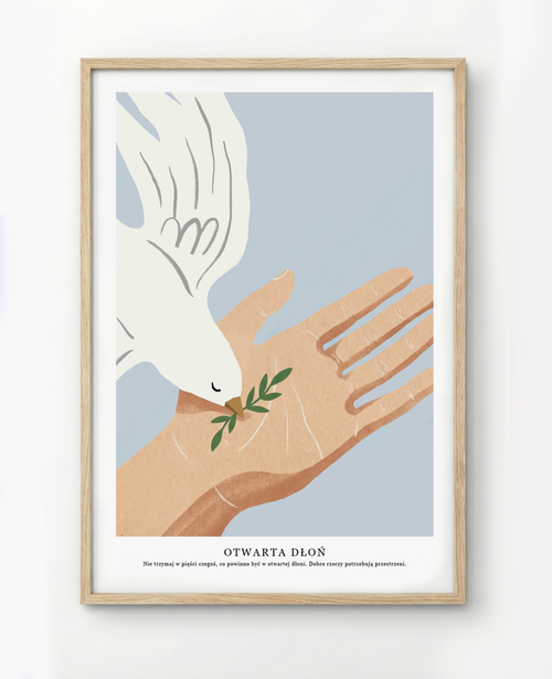 Ten plakat przypomina, że prawdziwa wolność i pokój przychodzą, gdy nie trzymamy w pięści tego, co powinno być w naszych otwartych dłoniach.
