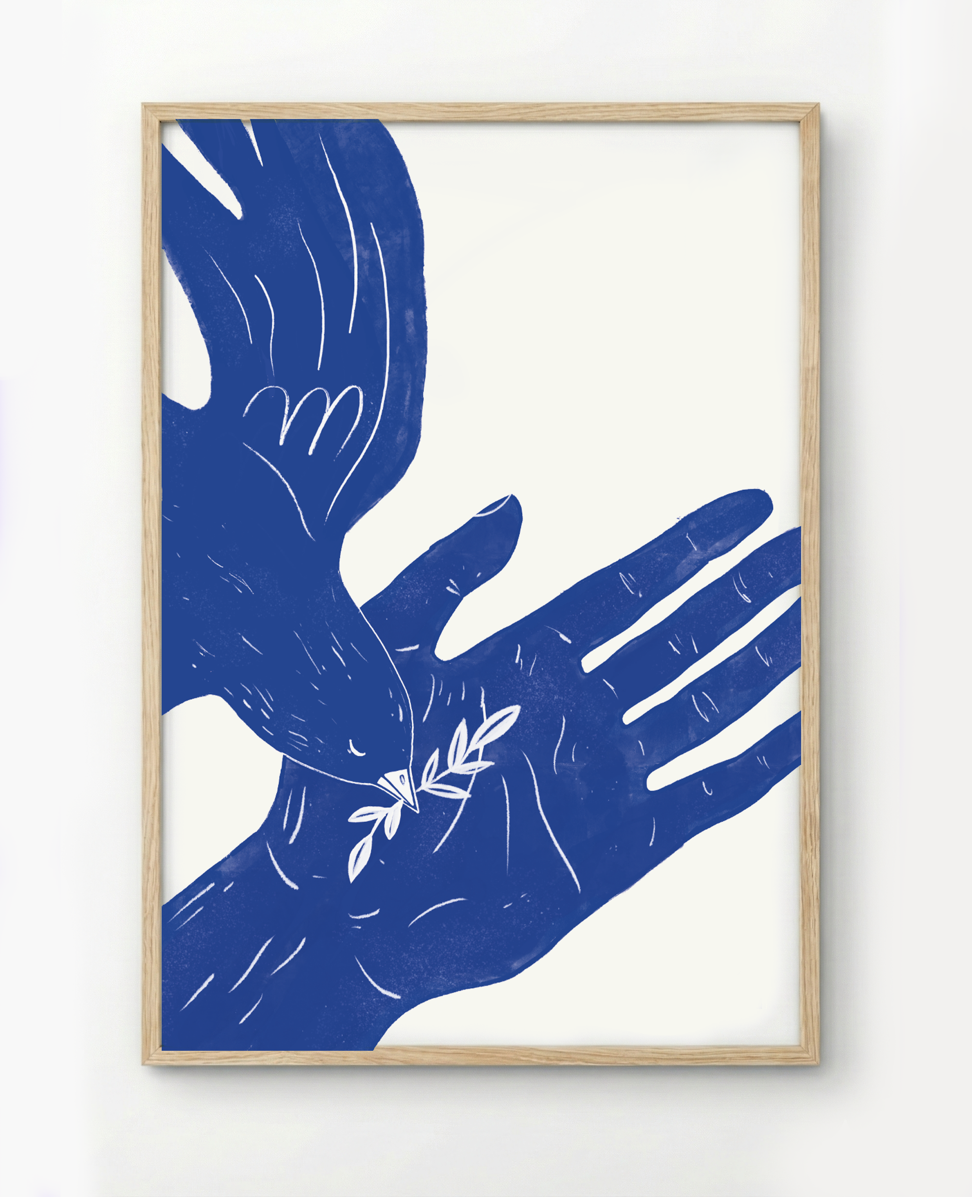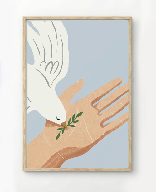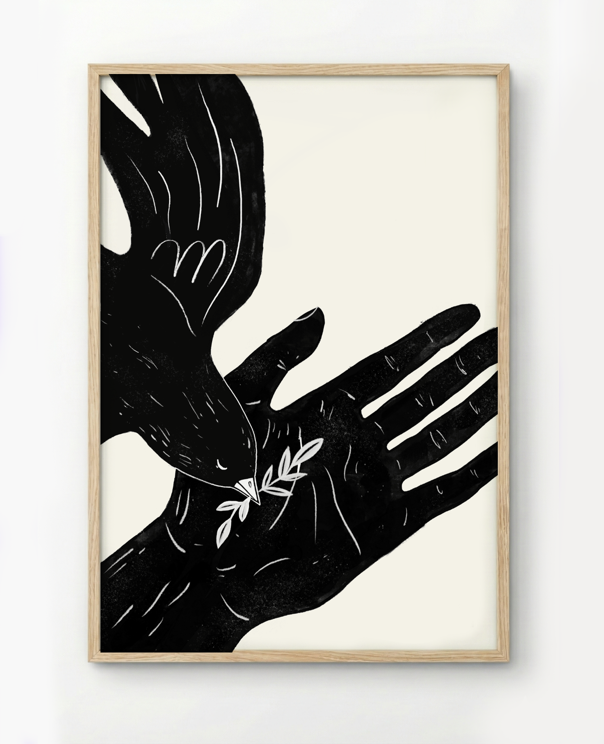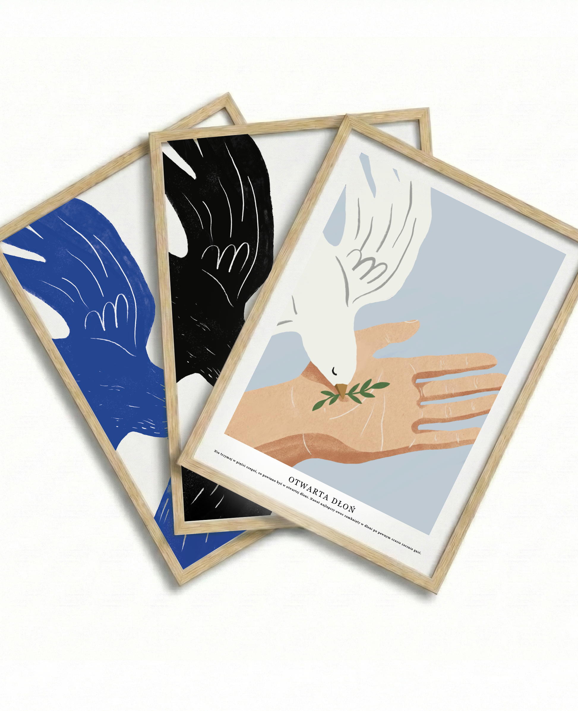 Ten plakat przypomina, że prawdziwa wolność i pokój przychodzą, gdy nie trzymamy w pięści tego, co powinno być w naszych otwartych dłoniach.